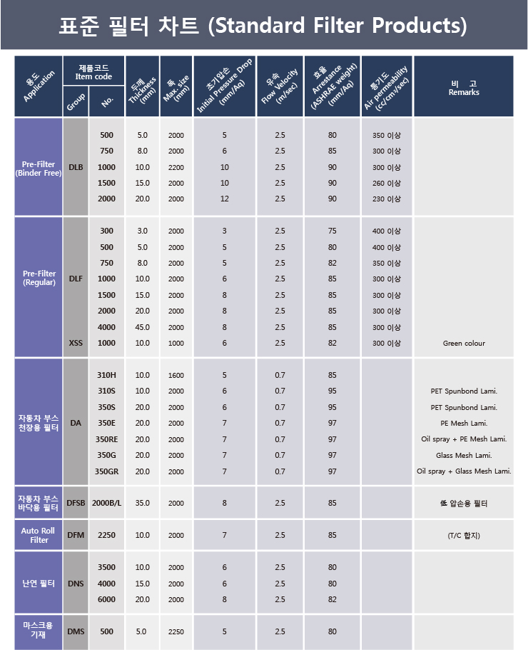 1. Polyester(P.E.T)에 밀도 구배를 주어 압력손실을 적게하여 점착 열가공 처리한 제품입니다.